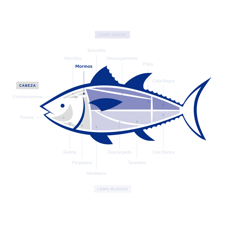 The Gadira Tuna Mormo is a cut located in the head of the wild bluefin tuna from almadraba with medium fat infiltration.