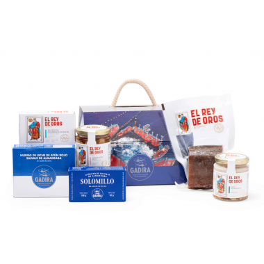 1 Tarro de ventresca de atún El Rey de Oros 250gr 1 Tronco de atún rojo de almadraba Gadira 120gr 1 Hueva de atún rojo de almadraba Gadira 237gr |